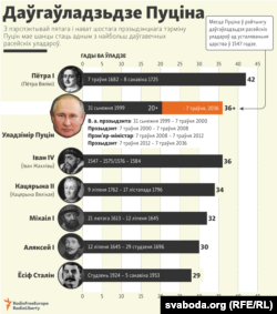 Калі Ўладзімір Пуцін пойдзе на пяты і шосты прэзыдэнцкія тэрміны, ён застанецца пры ўладзе да 2036 году. У рэйтынгу расейскіх уладароў яго б тады апярэдзіў толькі цар Пётар І.
