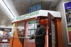 На другім паверсе вакзалу ў абменьніку банку МТБ былі і даляры, і эўра, і расейскія рублі — праўда, няшмат. «Ёсьць 200 даляраў, 150 эўра і шмат расейскіх рублёў», — адказала касірка. На пытаньне, ці зьвяртаюцца цяпер у абменьнік іншаземцы, касірка зьдзіўлена паглядзела на карэспандэнтку Свабоды і адказала: «Вы што, ня ведаеце, што ўсе межы закрытыя, нікога ў краіну не пускаюць? Наагул у мяне сёньня вельмі мала народу, за 4 гадзіны працы зьвярнуліся чалавек 10».