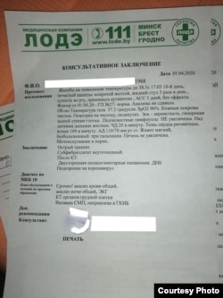 Сёння, 5 красавіка, яна зьвярнулася ў прыватны мэдычны цэнтар ЛОДЭ, дзе ёй зрабілі рэнтген і КТ. Вынік — двухбаковая пнэўманія. У заключэньні таксама напісана, што ёсьць падазрэньне на каранавірус. Маці адвезьлі ў пульманалёгію 3-й бальніцы, там ужо ўзялі мазкі на каранавірус».