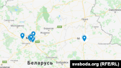 Мапа лякарняў у Менску і абласных цэнтрах Беларусі, дзе трымаюць хворых на COVID-19, людзей з падазрэньнем на каранавірусную інфэкцыю ці кантакты першага ўзроўню.