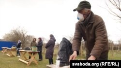 Людзей няшмат. Сталы ў двары паставілі так, каб захоўвалася «сацыяльная дыстанцыя». Генадзь прыехаў асьвяціць ежу — паскі і яйкі, з Марозавічаў. Ён зьбіраецца і на начную службу ў царкву. «І булкі пасьвяціць, і ў царкве пабыць — гэта традыцыя, ня трэба яе парушаць. У царкве я не баюся заразіцца — гэта сьвятое месца. Але меры засьцярогі буду прымаць. Я хоць і сівы, але жыць хочацца», — кажа Генадзь.