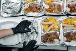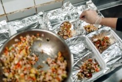 Пакуль абед гатуецца, трэба раскласьці аднаразовы посуд. Аляксандар — афіцыянт. Сёньня ягоная праца — падрыхтаваць аднаразовыя кантэйнэры для супу, у тэрмаўстойлівыя ланчбоксы пакласьці фольгу, каб стравы хутка ня стылі, сурвэткі і аднаразовыя прыборы.