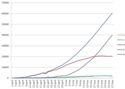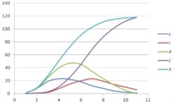 Пабудуем ідэальны графік любой эпідэміі з парамэтрамі x (i), X (i), c (i), C (i), A (i). На восі y адкладаем значэньні гэтых парамэтраў, а на восі x — дні.