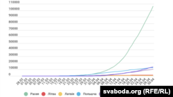 Прырост агульных выпадкаў захворваньня на COVID-19 у Беларусі і суседзяў за шэсьць дзён (з 24 красавіка) выглядае наступным чынам: