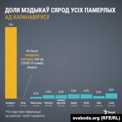 Узровень сьмяротнасьці ад каранавірусу ў Беларусі адзін з самых нізкіх у сьвеце. У той жа час Беларусь апярэджвае большасьць краінаў сьвету доляй мэдыкаў сярод памерлых. Паводле падлікаў Свабоды, кожны дзясяты загінулы ад COVID-19 у Беларусі — мэдык. Гэта ў 15 разоў больш, чым у Італіі, і ў 30 разоў больш, чым у ЗША. Разьбіраемся, як такое магло здарыцца.