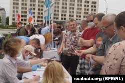 «Словы Лукашэнкі, што ён не аддасьць нікому краіны гучаць камічна, — даводзілі ахвотнікі падпісацца за альтэрнатыўных вылучэнцаў на прэзыдэнцтва. — Беларусь не ягоная ўласнасьць. Яна належыць народу і ён мае права мяняць кіраўніка...».