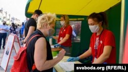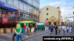 «Ня важна, у якую палатку. Малайцы, што вам сказалі, што такая магчымасьць сёньня будзе», — адказала тая. «А нічога страшнага, што мы ўжо подпісы зьбіралі?», — спрабавала даведацца жанчына «з садка». «Тады ня трэба», — запэўніла прадстаўніца «Белай Русі».
