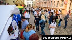 Невялікія групкі людзей, якія чакалі пачатку, нібы па нябачным знаку моўчкі сталі ў чэргі да столікаў па 10-15 чалавек.