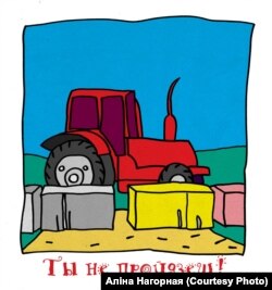 «Гэта малюнак пра мясцовы пратэст. Па нашай вуліцы езьдзілі трактары і вельмі псавалі дарогу. Мы пісалі звароты, дарогу пэрыядычна крыху паляпшалі, але праз пару трактароў дарога зноўку была ніякай. Тады я і іншыя жыхары вёскі знайшлі старыя лядоўні і зрабілі зь іх барыкады, каб перакрыць праезд трактароў. Гэта дапамагло. Барыкады стаялі шэсьць месяцаў, за гэты час невядомыя людзі спрабавалі некалькі разоў іх адцягнуць, але мясцовыя жыхары іх яшчэ больш умацоўвалі — і ў выніку іх стала немагчыма зрушыць. У выніку Рагачоўскі райвыканкам сваім рашэньнем забараніў трактарам езьдзіць па гэтай дарозе. А зусім нядаўна тут устанавілі знак, які забараняе праезд цяжкай тэхнікі, мы перамаглі».