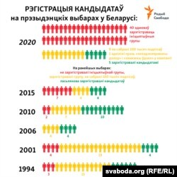 Палітоляг Міхаіл Пліско, які рыхтуе да выданьня кнігу аб прэзыдэнцкіх выбарах 1994 году, расказваў Свабодзе, што на тых першых выбарах не зарэгістравалі ініцыятыўныя групы трох прэтэндэнтаў: