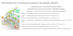 Адміністрацыя Савецкага раёну апублікавала расклад мерапрыемстваў у парку Дружбы народаў на ўвесь тыдзень. Раней штаб Ціханоўскай прызначыў на 6 жніўня мітынг-канцэрт у гэтым самым парку. Цяпер там у праграме — сьвяткаваньне Дня чыгуначных войскаў.