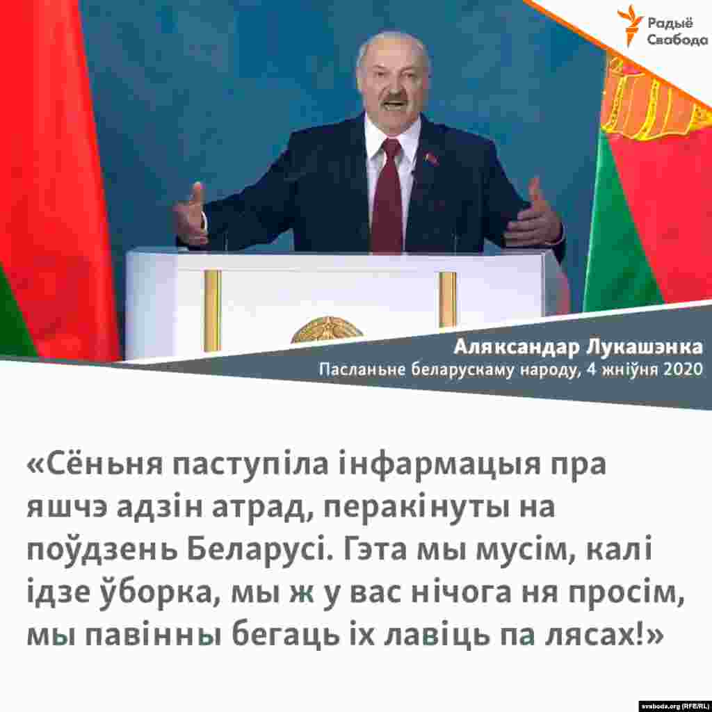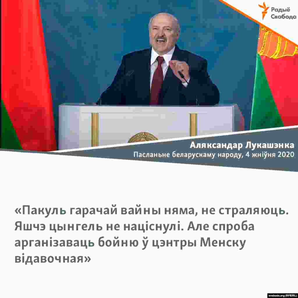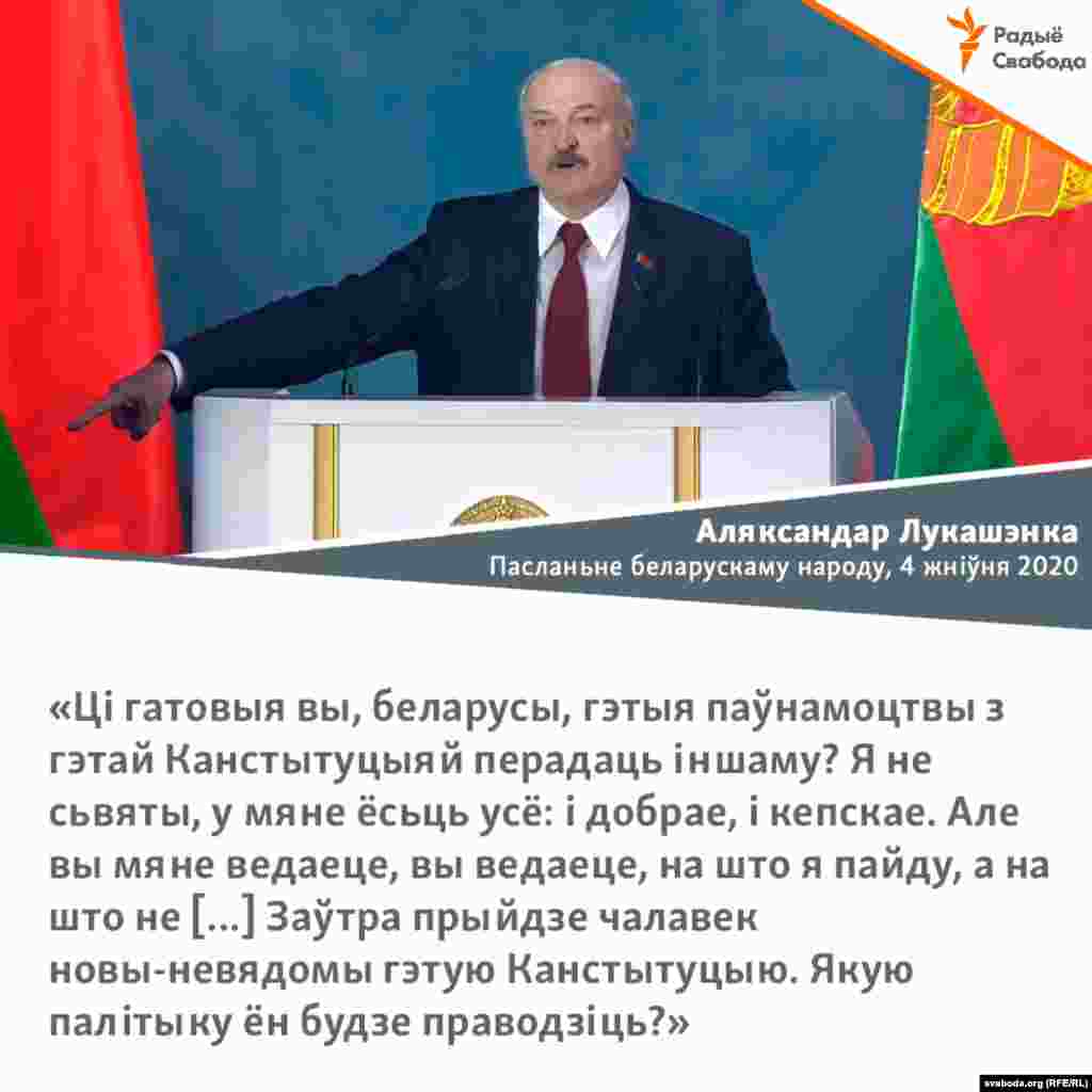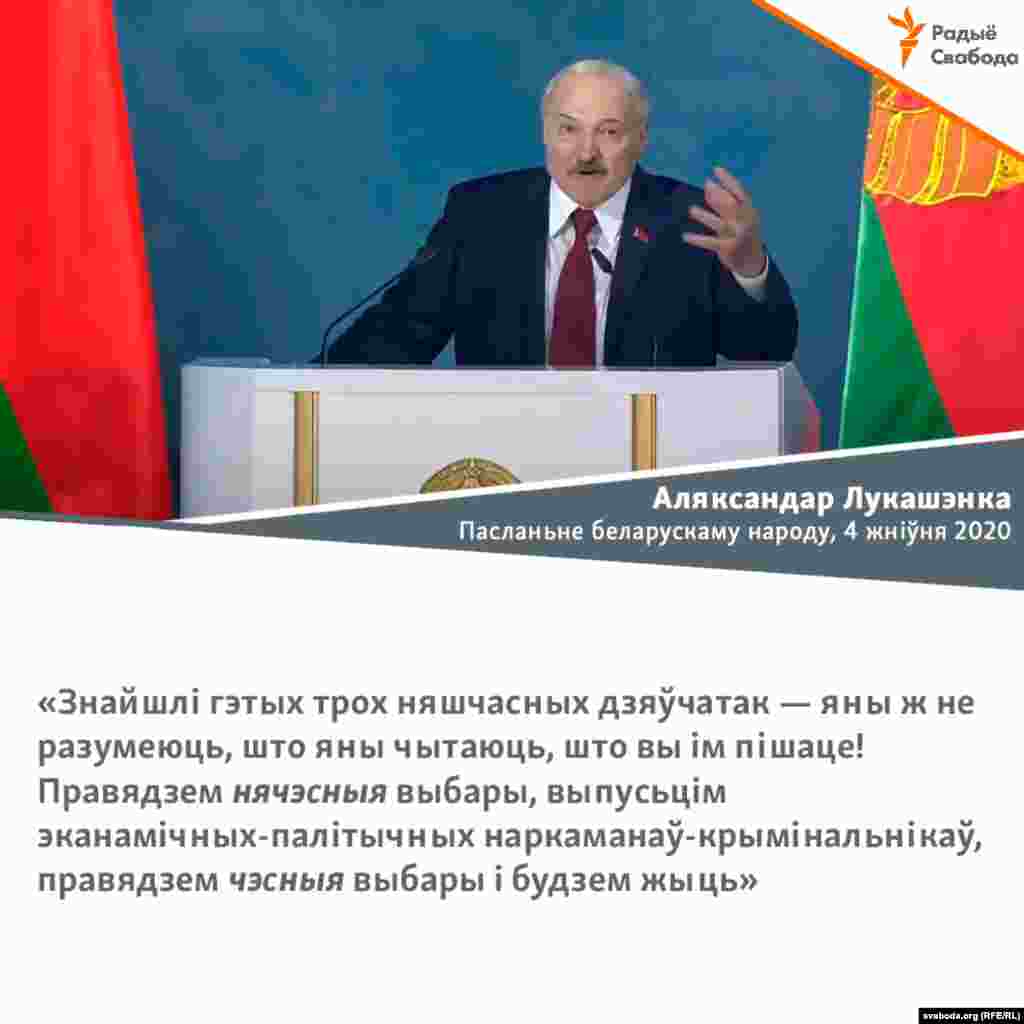 Аляксандар Лукашэнка выступіў 4 жніўня з пасланьнем да беларускага народу і дэпутатаў. Традыцыйна такое пасланьне адбываецца ўвесну, ды сёлета яго перанесьлі на жнівень. Пасланьне адбылося ў дзень пачатку датэрміновага галасаваньня. Доўжылася яно паўтары гадзіны.
