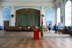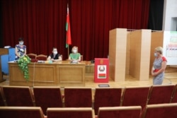 «Тут у нас назіральнікі, тут кабінкі, тут скрыня для галасаваньня, — расказвае старшыня выбарчай камісіі Лілія Шатраўка. — Шторак на кабінках няма, але мы і так ня бачым, што там адбываецца. Кабінкі так паставілі, што нам нічога не відаць».