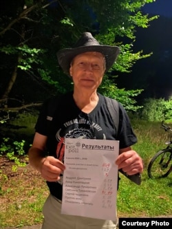 Жыхар Мюнхэну Юры Рудэрман дэманструе вынікі экзыт-полу галасаваньня ў беларускім кансуляце сталіцы Баварыі: