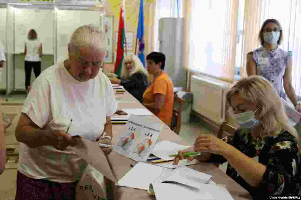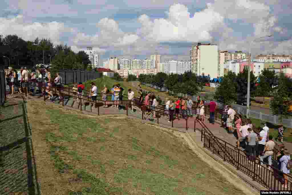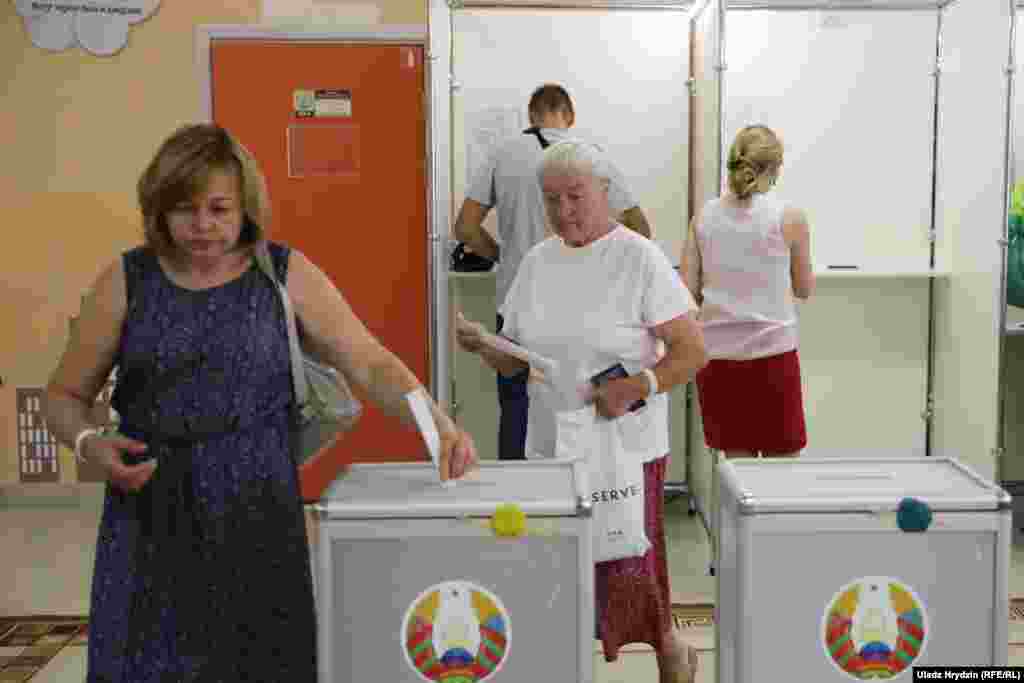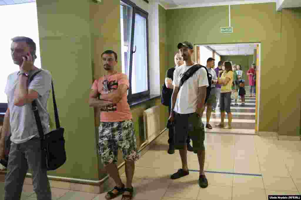 Днём 9 жніўня перад школай № 41, што на вуліцы Алеся Гаруна ў менскім мікрараёне Дамброўка, утварыліся чэргі выбарнікаў. На ўчастку кабінкі закрытыя толькі з трох бакоў, шторак няма.