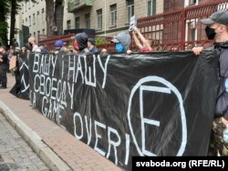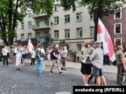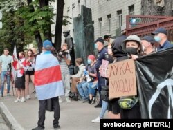 Амбасаду Беларусі ва Ўкраіне другі дзень ахоўваюць ва ўзмоцненым рэжыме — напярэдадні беларускія грамадзяне, якія не змаглі прагаласаваць, не разыходзіліся да позьняга вечара, а сёньня беларусы і ўкраінцы прыйшлі разам, каб патрабаваць спыніць гвалт і вызваліць усіх палітвязьняў.