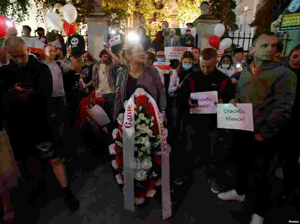 Акцыя салідарнасьці прайшла 11 жніўня насупраць беларускай амбасады ў Маскве. У ёй узялі ўдзел каля 200 чалавек. Актывісты выступілі з адзінкавымі пікетамі, усклалі кветкі і запалілі сьвечкі. Яны скандавалі лёзунгі ў падтрымку пратэстоўцаў у Беларусі і Сьвятланы Ціханоўскай, заклікалі Менск спыніць гвалт і перагледзець вынікі выбараў. Іх падтрымлівалі сыгналамі машыны, якія праяжджалі міма.