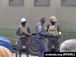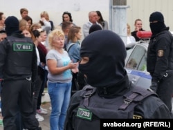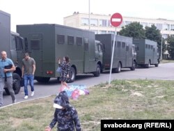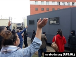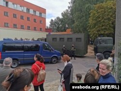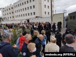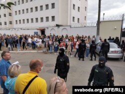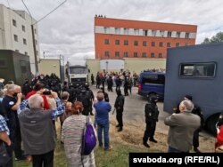 Перад будынкам стаіць каля 10 аўтазакаў. Па словах людзей, яшчэ 7 аўтазакаў за брамай турмы. На даху турмы сядзяць людзі ў чорным. Людзі мяркуюць, што гэта снайпэры.
