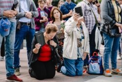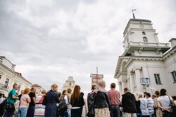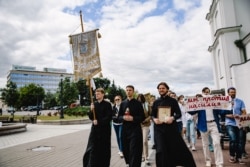 На чале хрэснага ходу ішлі трое сэмінарыстаў і дыякан архікатэдральнага касьцёла Юры Рашатко. Гэта малітоўная акцыя. Яны вераць, што з дапамогай малітвы можна спыніць гвалт, які чыніцца ў краіне.