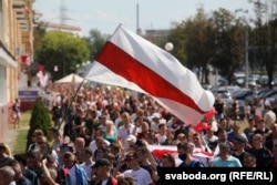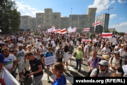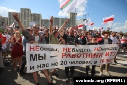 Калёна пэрыядычна скандуе «Выходзь!» і «Далучайся!». Пратэстоўцы патрабуюць адстаўкі Лукашэнкі, правядзеньня новых выбараў, вызваленьня палітвязьняў, спыненьня перасьледу ўдзельнікаў мірных акцыяў.