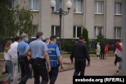 За гарвыканкамам побач зь мітынгам стаялі некалькі міліцэйскіх машын, за дзьвярыма ў будынку гарвыканкаму былі відаць амапаўцы ў чорнай форме. Да людзей яны не выходзілі.