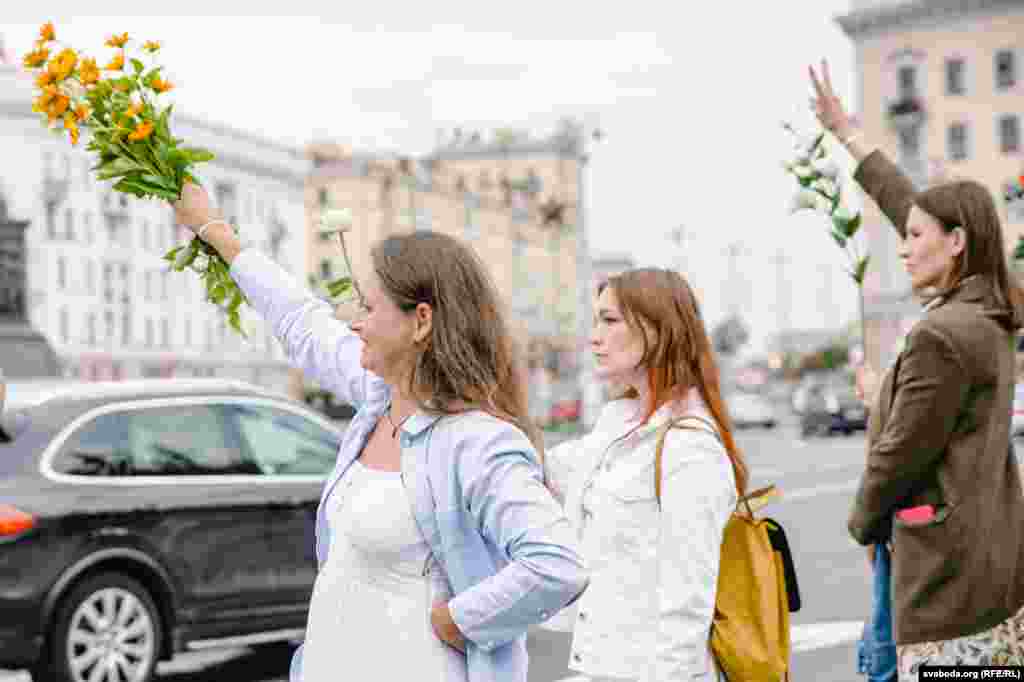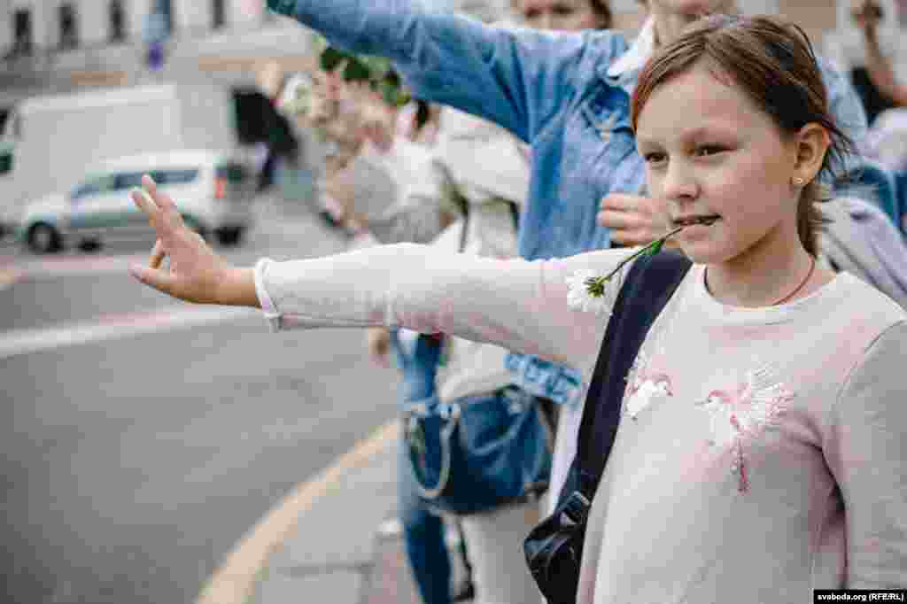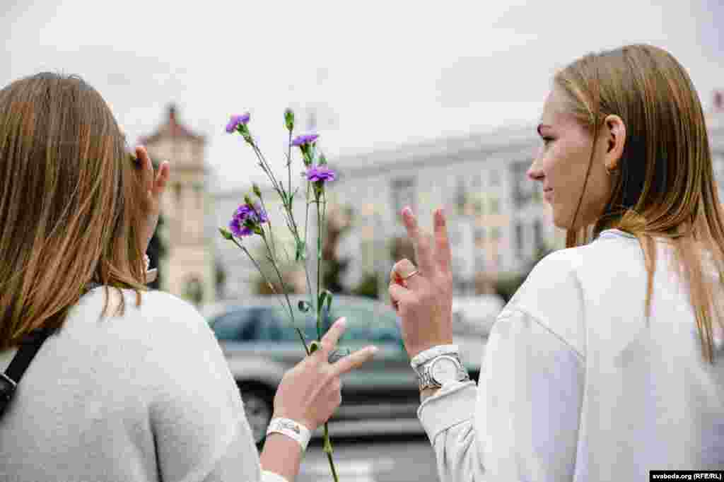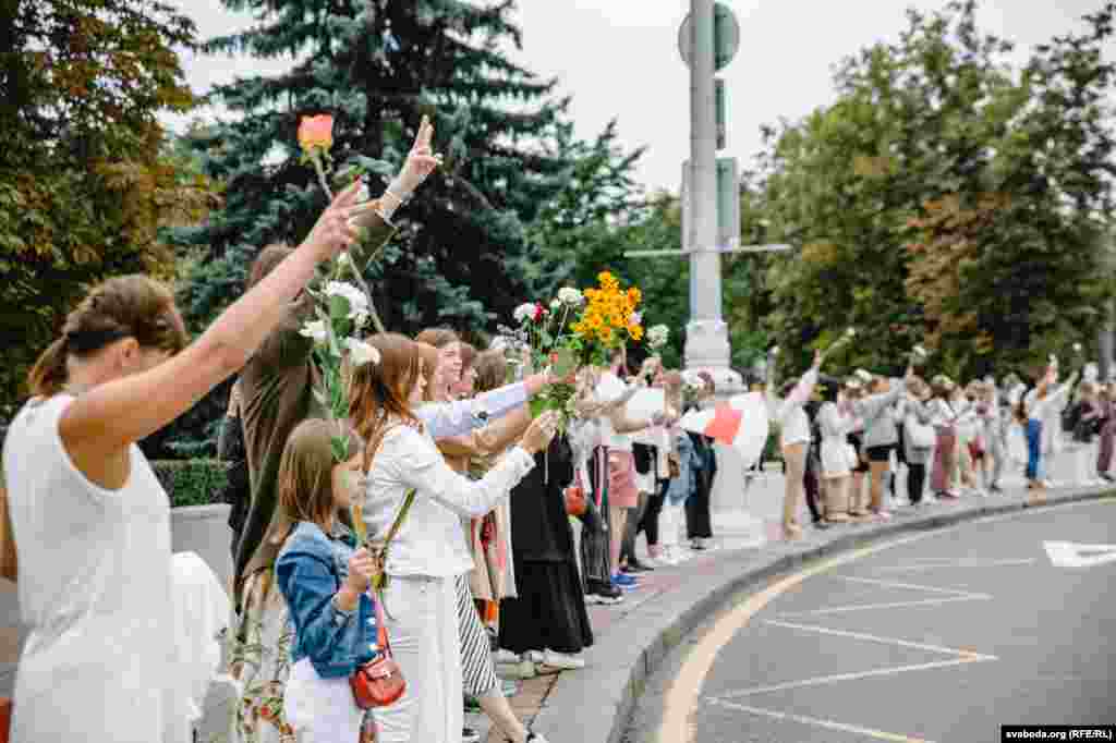 Людзі сталі ў «ланцуг салідарнасьці» на плошчы Перамогі ў Менску. Фотарэпартаж