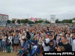 Апроч прыхільнікаў пераменаў зь бел-чырвона-белымі сьцягамі, на сустрэчу прыйшлі і людзі з афіцыйнымі чырвона-зялёнымі сьцягамі.