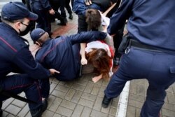 16.40 Студэнты заблякавалі міліцэйскую машыну. Да іх падбег АМАП, адну дзяўчыну зьбілі з ног.