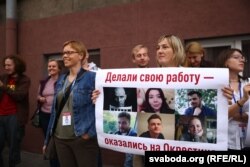 «Прэса — гэта сьвятое. Юры Караеў», «Свабоду журналістам», «Рабілі сваю працу — апынуліся на Акрэсьціна» — з такімі плякатамі прысутныя журналісты Tut.by, «Онлайнеру», «БелаПАН», «Нашай нівы» і іншых мэдыя сталі насупраць будынку МУС.