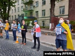 Беларускія і ўкраінскія актывісты прыйшлі да амбасады Беларусі ў Кіеве, каб выказаць салідарнасьць зь беларускім народам і адсьвяткаваць Дзень беларускай вайсковай славы.