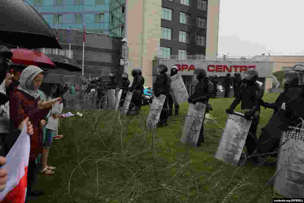 Паміж узброенымі сілавікамі на пляцоўцы каля стэлы і пратэстоўцамі — калючы дрот