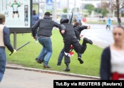 На праспэкце Пераможцаў, Нямізе ды іншых вуліцах Менску зьявіліся людзі ў цывільным, якія білі пратэстоўцаў. Яны хадзілі ў бронекамізэльках і ўзброеныя дубінкамі.