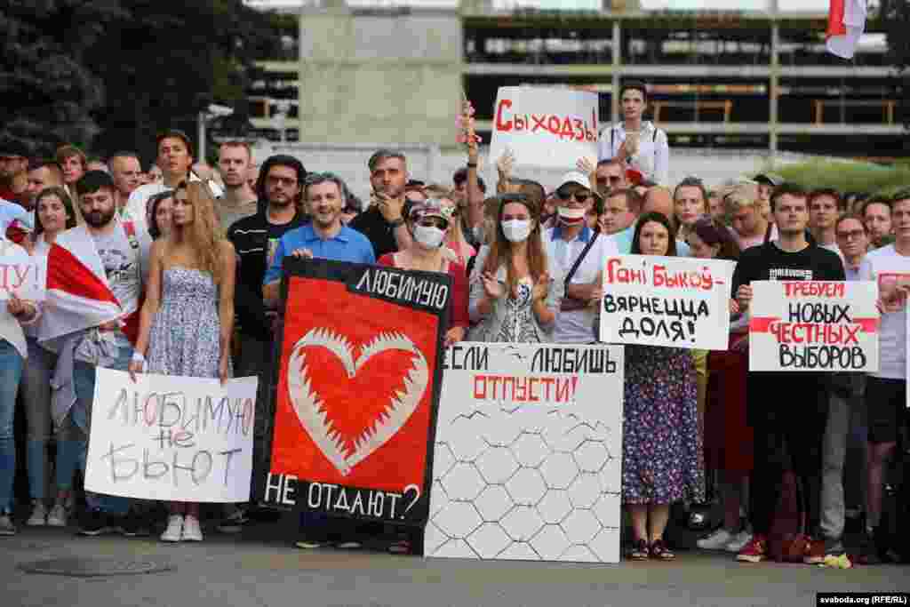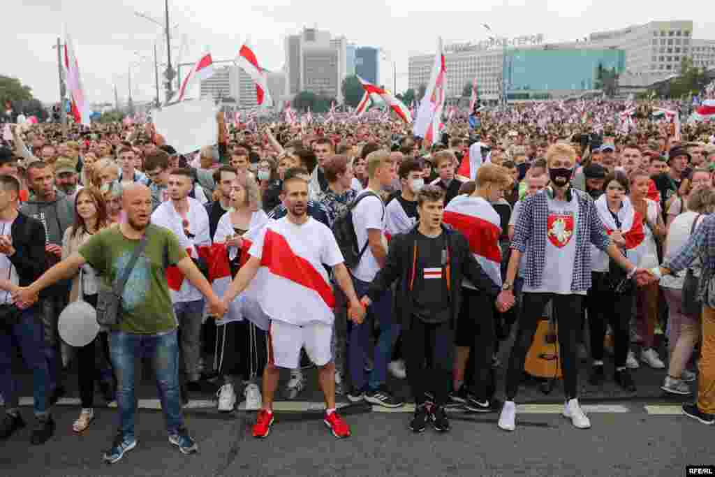 14 жніўня. Стыхійная акцыя пратэсту каля Дому ўраду ў Менску доўжылася каля чатырох гадзін, у ёй узялі ўдзел некалькі тысяч чалавек. Будынак ахоўваў ланцуг з 30 салдат у касках і са шчытамі. Да іх падышлі дзяўчаты з кветкамі.