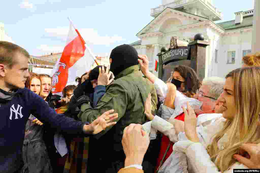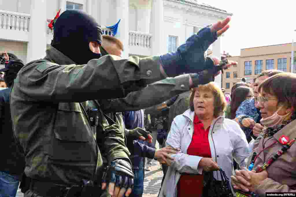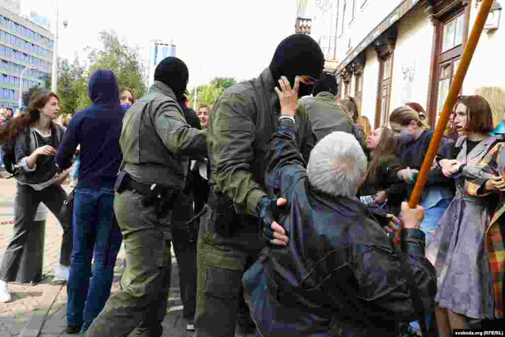 Хутка на плошчу Свабоды пад’ехалі мікрааўтобусы з танаванымі шыбамі і 5 аўтазакаў, сілавікі пачалі жорстка затрымліваць жанчын: некаторых валаклі па зямлі.