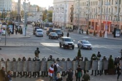 Тым часам праспэкт Незалежнасьці ў Менску пустуе, толькі сілавікі стаяць у шэрагу.