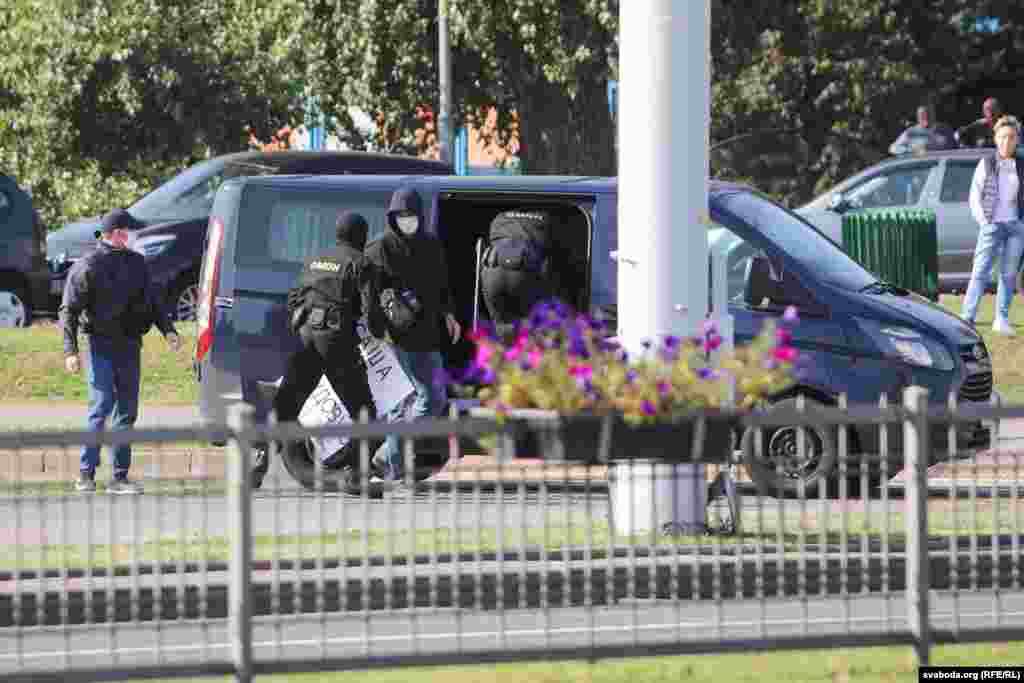 20Начальнік службы аховы Лукашэнкі Андрэй Паўлючэнка (у цэнтры) каля Палацу Незалежнасьці