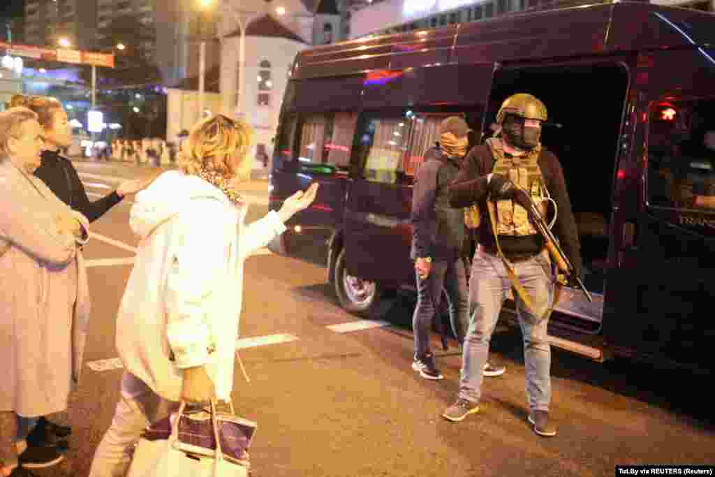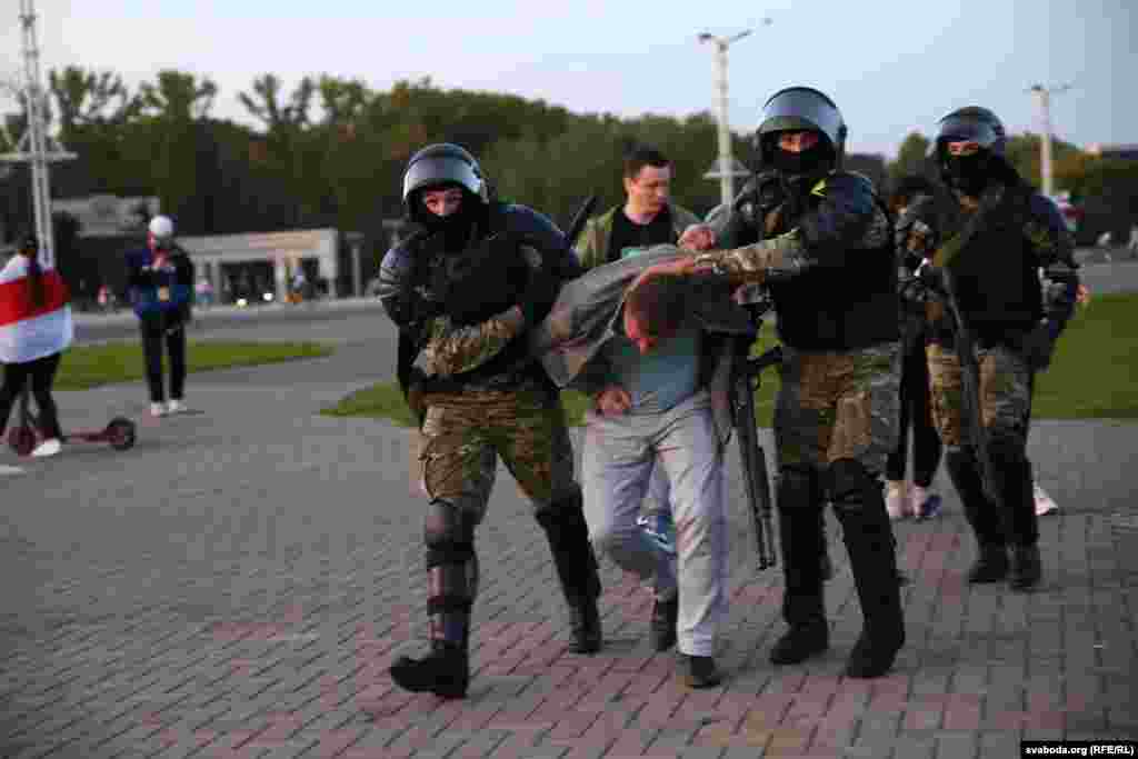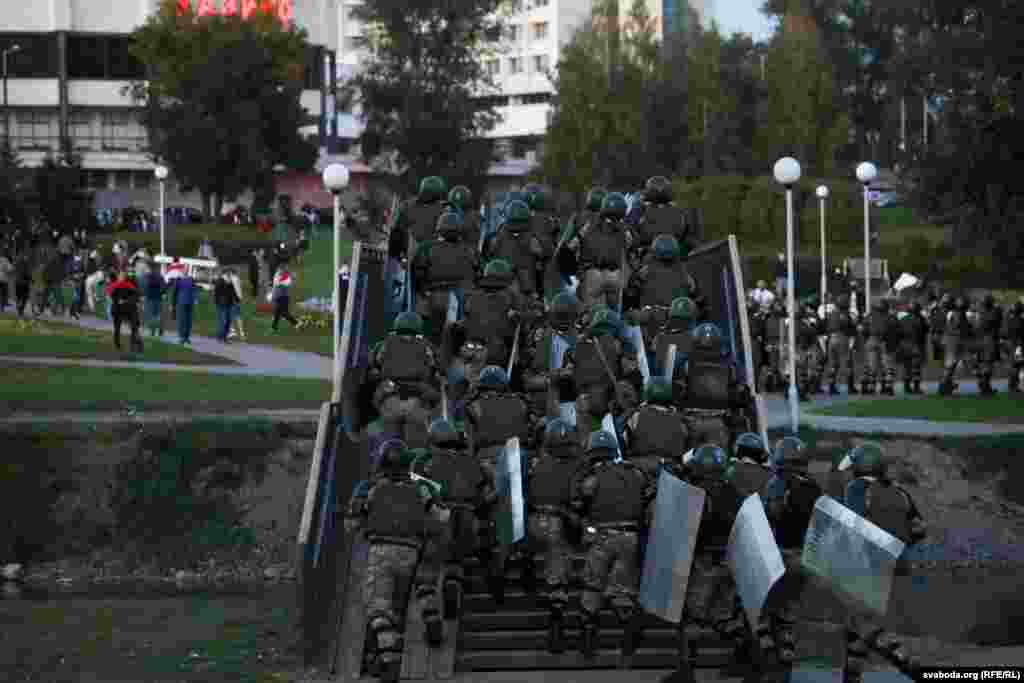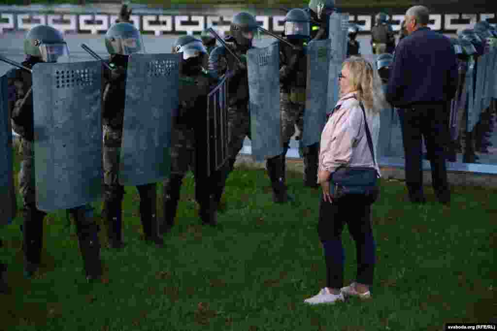 Пасьля 19-й гадзіны ля стэлы зьявіліся дзясяткі аўтазакаў, міліцэйскіх аўтобусаў і вадамётаў