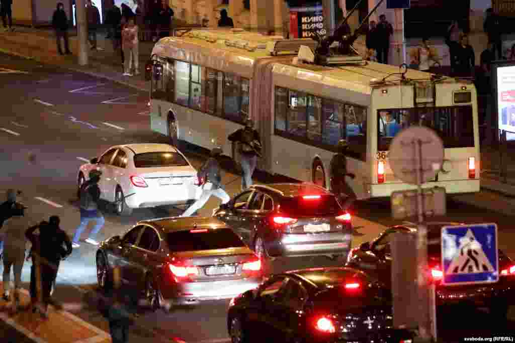 Людзі абступілі машыну ГУБАЗіК пасьля затрыманьня хлопца, патрабавалі выпусьціць яго