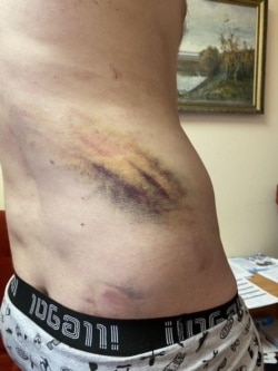 У мужа моцных сінякоў не было. Былі «калідоры» зь сілавікоў, калі іх пераводзілі з гаража ў спартзалю. Вось там Кірыл атрымаў гематому на назе.