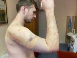 Там было 4-5 чалавек. Яны пачалі мяне штурхаць, наносіць удары. Я ляжаў на падлозе; білі дубінкамі, нагамі. Затым адзін з гэтых людзей запатрабаваў, каб я перавярнуўся на сьпіну, зьняў зь мяне левую красоўку. Мяне трымалі за нагу і наносілі ўдары па левай костачцы. Я ня ведаў, што костачка можа так ацякаць. У мяне, напэўна, разы ў два нага ацякла. Я думаў, што трапіў у нейкую паралельную рэальнасьць.