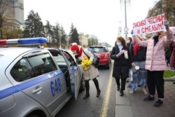 Яны стаяць без сьцягоў, плякатаў, лёзунгаў. Міліцыянты падыходзяць і размаўляюць зь імі. З аўтазаку гучыць музыка і папярэджаньні па-беларуску.