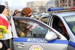 Дэманстрантак падтрымліваюць кіроўцы машын. Недалёка ад скрыжаваньня праспэкта з вуліцай Янкі Купалы супрацоўнікі ДАІ ў суправаджэньні чатырох мікрааўтобусаў сілавікоў спынілі вадзіцеля, які сыгналіў удзельніцам маршу. Яго адвялі для разгляду ў машыну дарожна-патрульнай службы.
