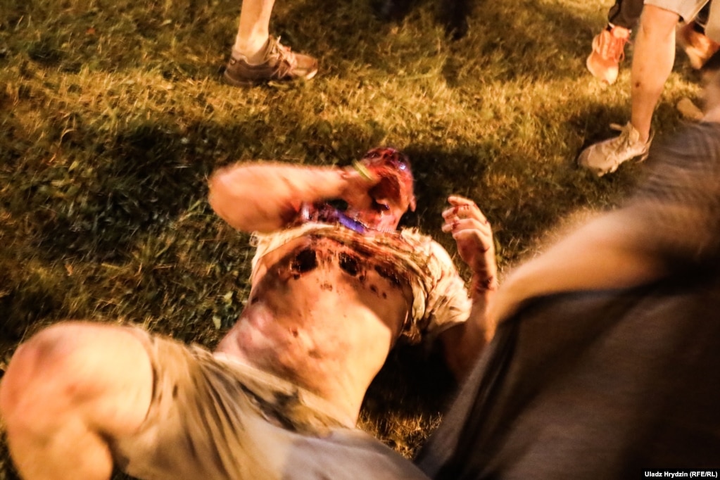 «Я нічога больш ня чуў, — кажа ён. — Упаў, усё было запаволена — дакладна так, як паказваюць у фільмах. Папоўз да травы, з рота лілася кроў. Сам увесь у крыві быў. Прапоўз я мэтраў сем. А потым усё, упаў. Мяне падабралі нейкія хлопцы, аднесьлі далей ад сілавікоў, да хуткай. Там быў адзін мужчына. Ён назваўся былым вайскоўцам і загадаў прынесьці скотч, каб заклеіць мае раны. Далучыўся фэльчар хуткай, мне паставілі кропельніцу, зрабілі іньекцыю. Я ўсё памятаю, быў у прытомнасьці. Памятаю, як павезьлі ў хуткай. Пэўны час вырашалі, куды мяне везьці, каб я не памёр у дарозе. Так і гаварылі адкрыта. Я тады думаў, каб мяне хоць куды хутчэй адвезьлі».