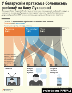 Сацыёлягі расейскага «Лявада -Цэнтру» правялі ў Расеі апытаньне: «У сытуацыі пратэстаў у Беларусі, на чыім баку вашы сымпатыі – Лукашэнкі альбо пратэстоўцаў?» Адказы падзяліліся ў залежнасьці ад таго, адкуль рэспандэнты атрымліваюць інфармацыю.