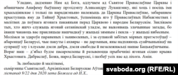 «пабожны беларускі народ трапіў цяпер у цяжкі час, калі на загад самазванца — былога прэзыдэнта А. Лукашэнкі, апантанага д’яблам, дзяцей нашых забіваюць і зьдзекуюцца з братоў і сёстраў нашых. Гэты кат і ягоныя хаўрусьнікі чыняць крывавыя расправы над мірнымі людзьмі на вуліцах і ў турмах у сталічным Менску і ў розных гарадох шматпакутнае Беларусі, услаўляючы й працягваючы багаборніцкую палітыку бальшавікоў, адкрыта парушаюць Запаветы Божыя, разбураюць памятныя мэмарыялы супачылых...»