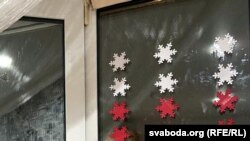 Ірына да Калядаў вырашыла ўпрыгожыць сваё вакно бел-чырвона-белымі сьняжынкамі.