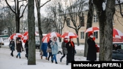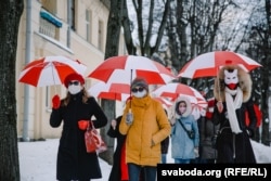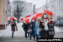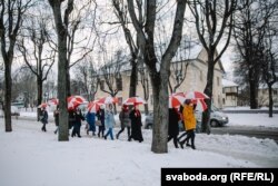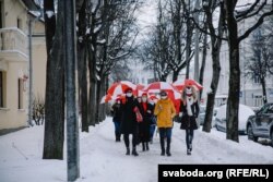 Жанчыны зь бел-чырвона-белымі парасонамі выйшлі на шпацыр у менскай Асмалоўцы.