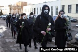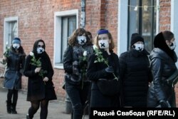 Жанчыны ў чорных строях моўчкі прайшліся па вуліцы Кастрычніцкай. У руках яны трымалі белыя ружы, а нанесеныя паўзьверх мэдычных масак крыжы імітавалі залеплены рот і адначасова забарону на свабоду слова.