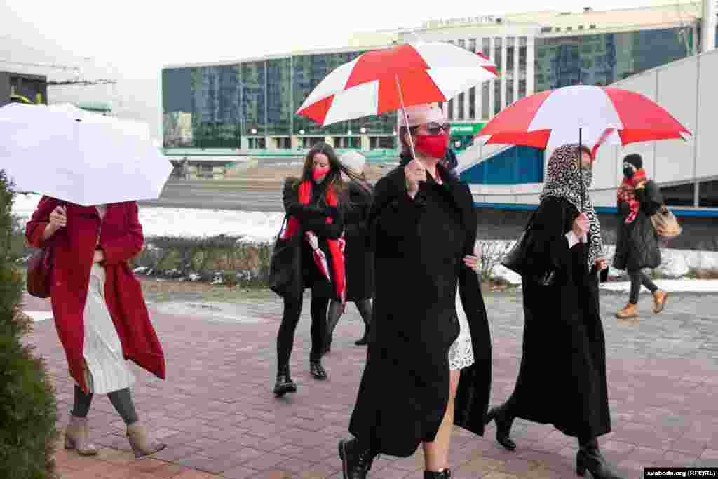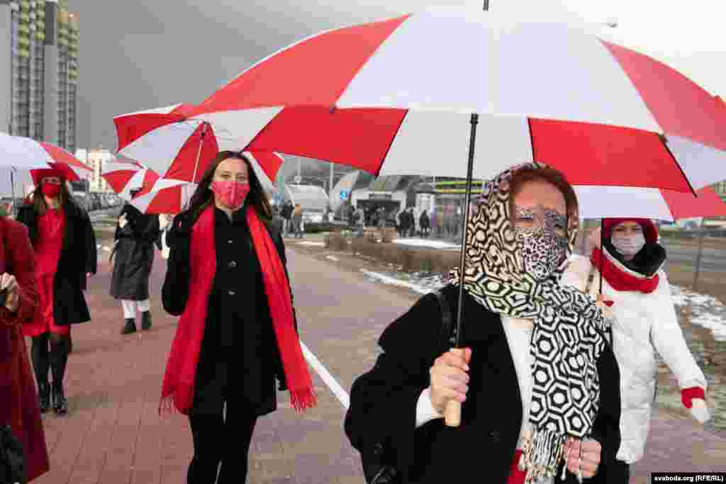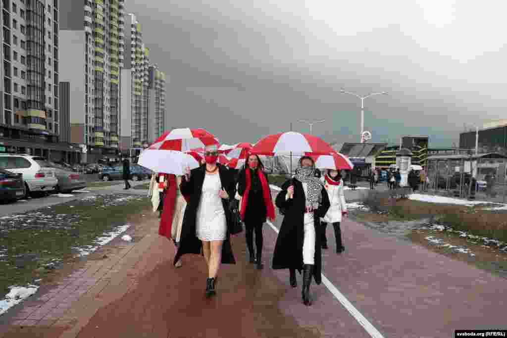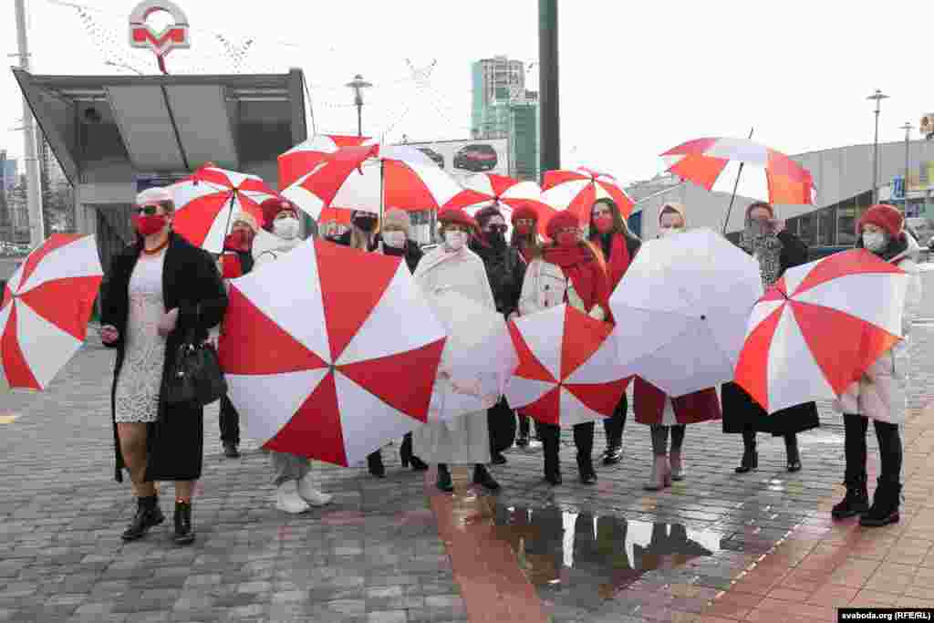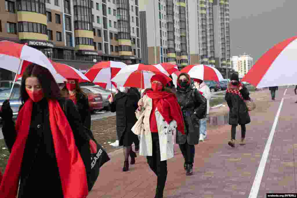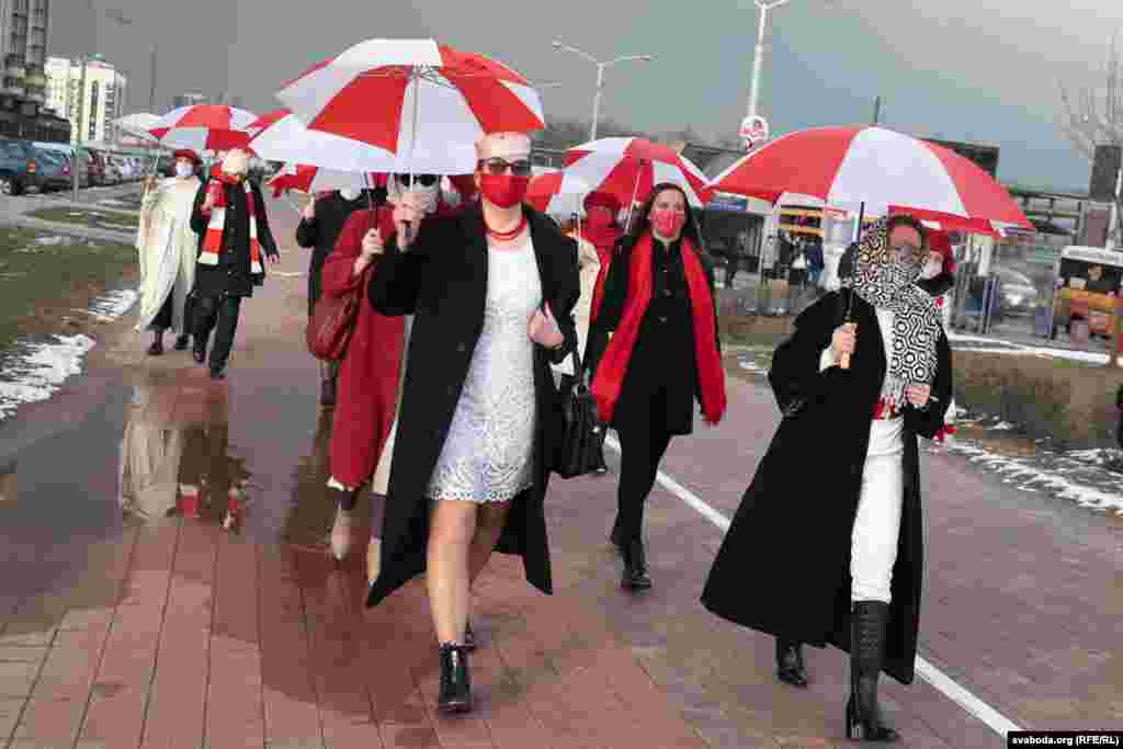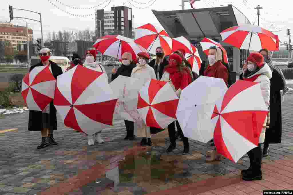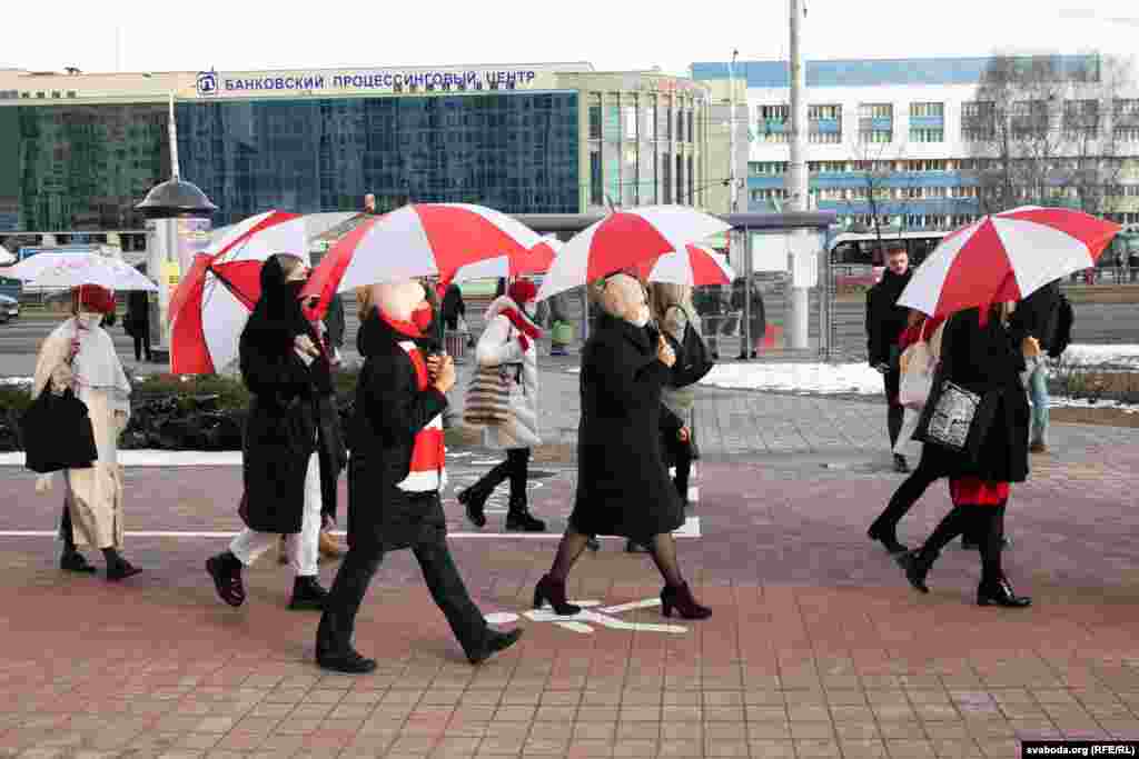 Шэсьце жанчын зь бел-чырвона-белымі парасонамі ў цэнтры Менску. 8 здымкаў