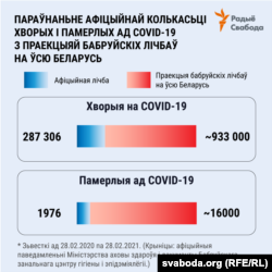 - Калі ўзяць лічбы за год з 28 лютага 2020-га па 28 лютага 2021-га, дык па ўсёй краіне афіцыйна захварэлі 287 306 чалавек (прыблізна 3% насельніцтва), а ў адным горадзе Бабруйску — 21 059 чалавек (каля 10% ад яго насельніцтва)